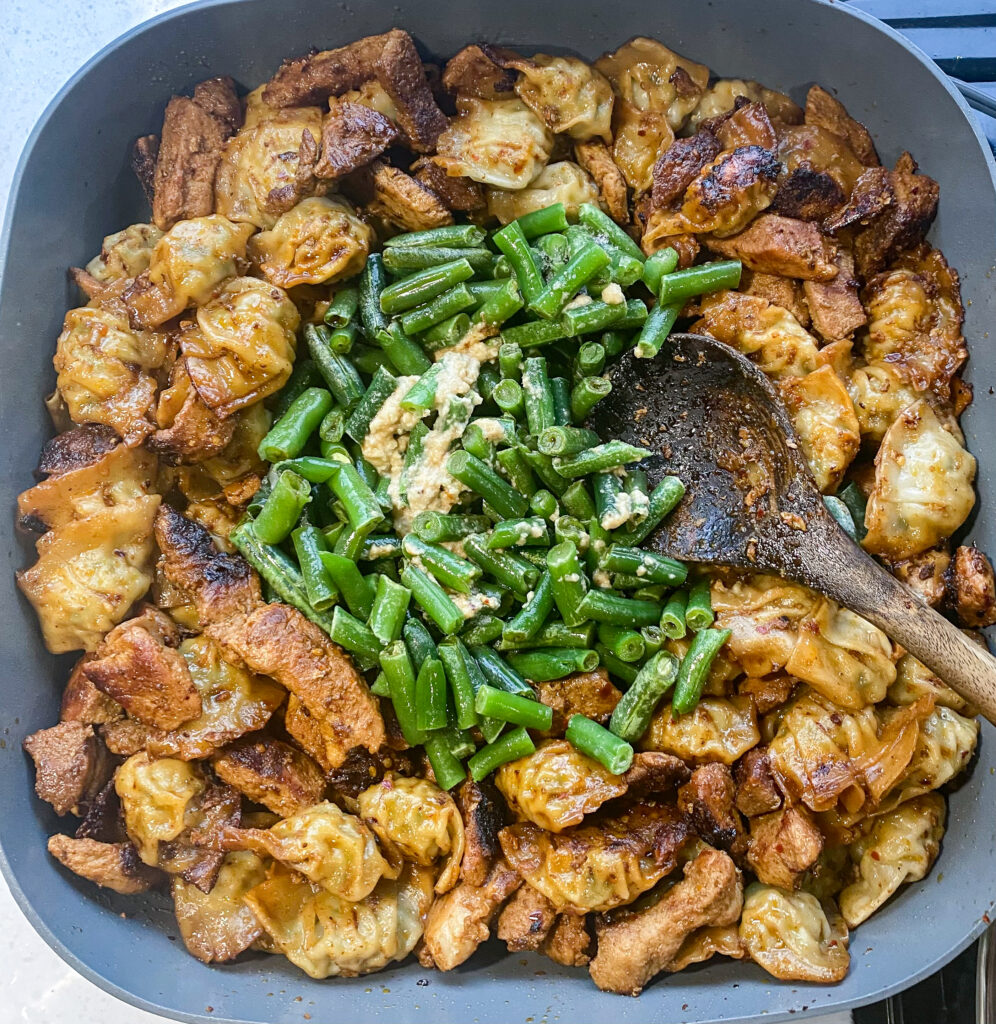 Next, once my mini wontons are cooked through and have some good color on them, I pour an entire bag of frozen green beans in the pan, along with my garlic paste and soy sauce. I’ve found that frozen green beans don’t need a ton of cooking and only need to be warmed through.