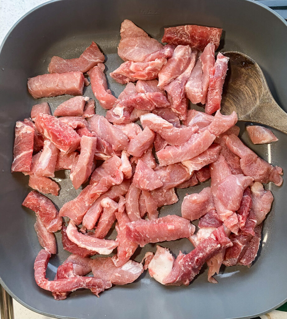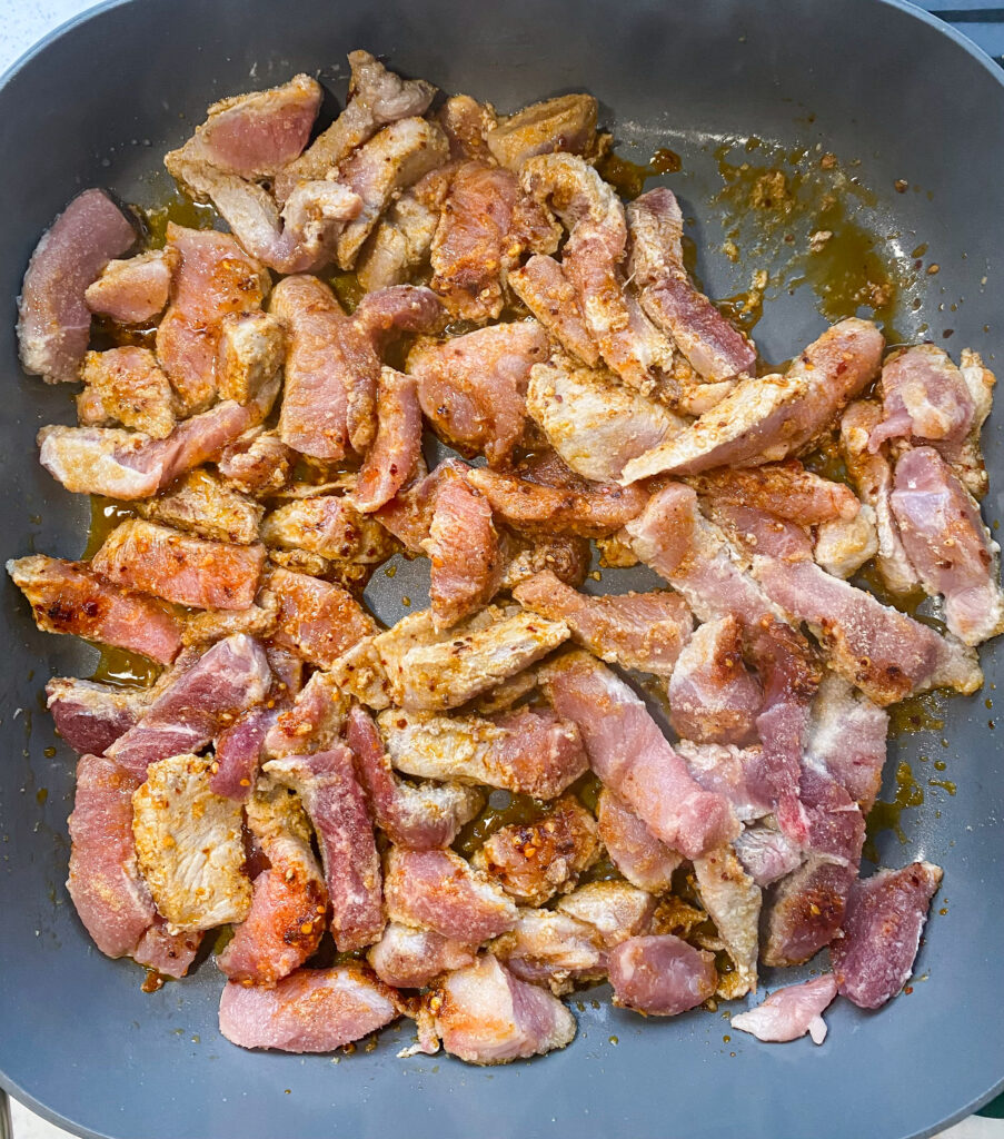 First, begin by adding strips of sliced pork loin chops to your pan. Because the meat is lean, I added a few teaspoons of avocado oil to my skillet. I then seasoned my meat with onion powder and chili crunch oil and begin cooking on about medium heat (all electric skillets and stoves cook at different temperatures).
